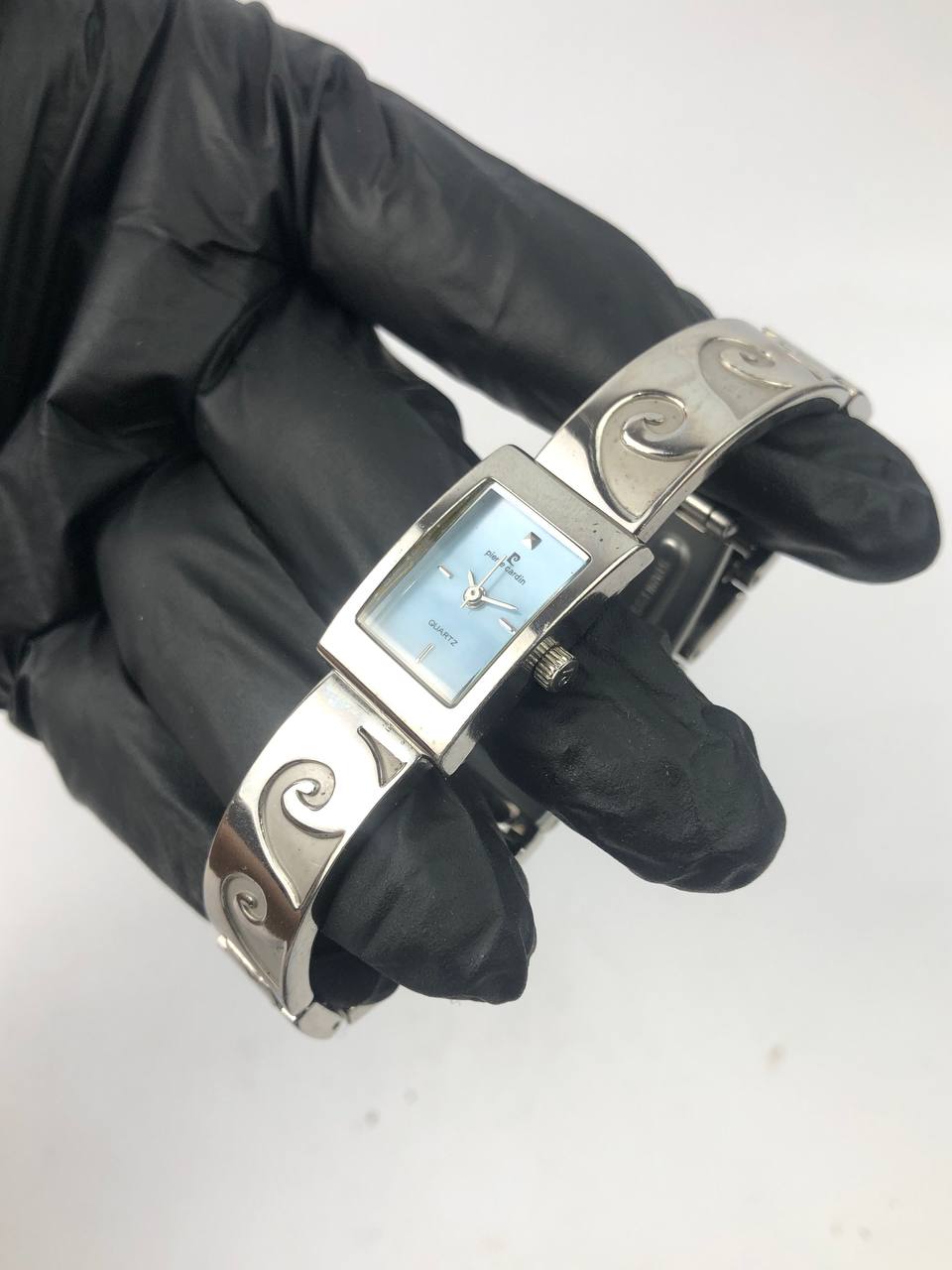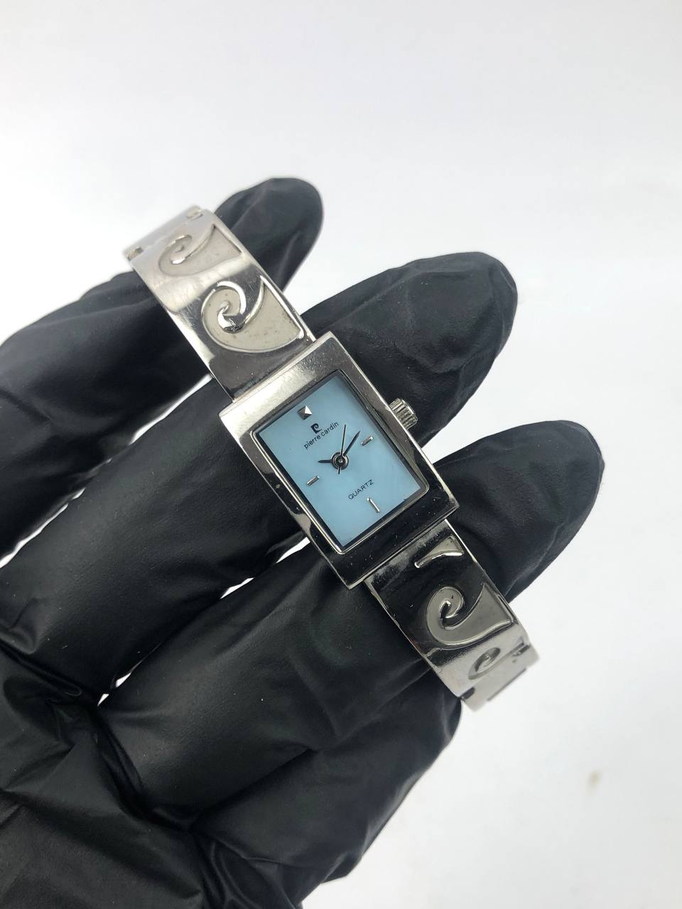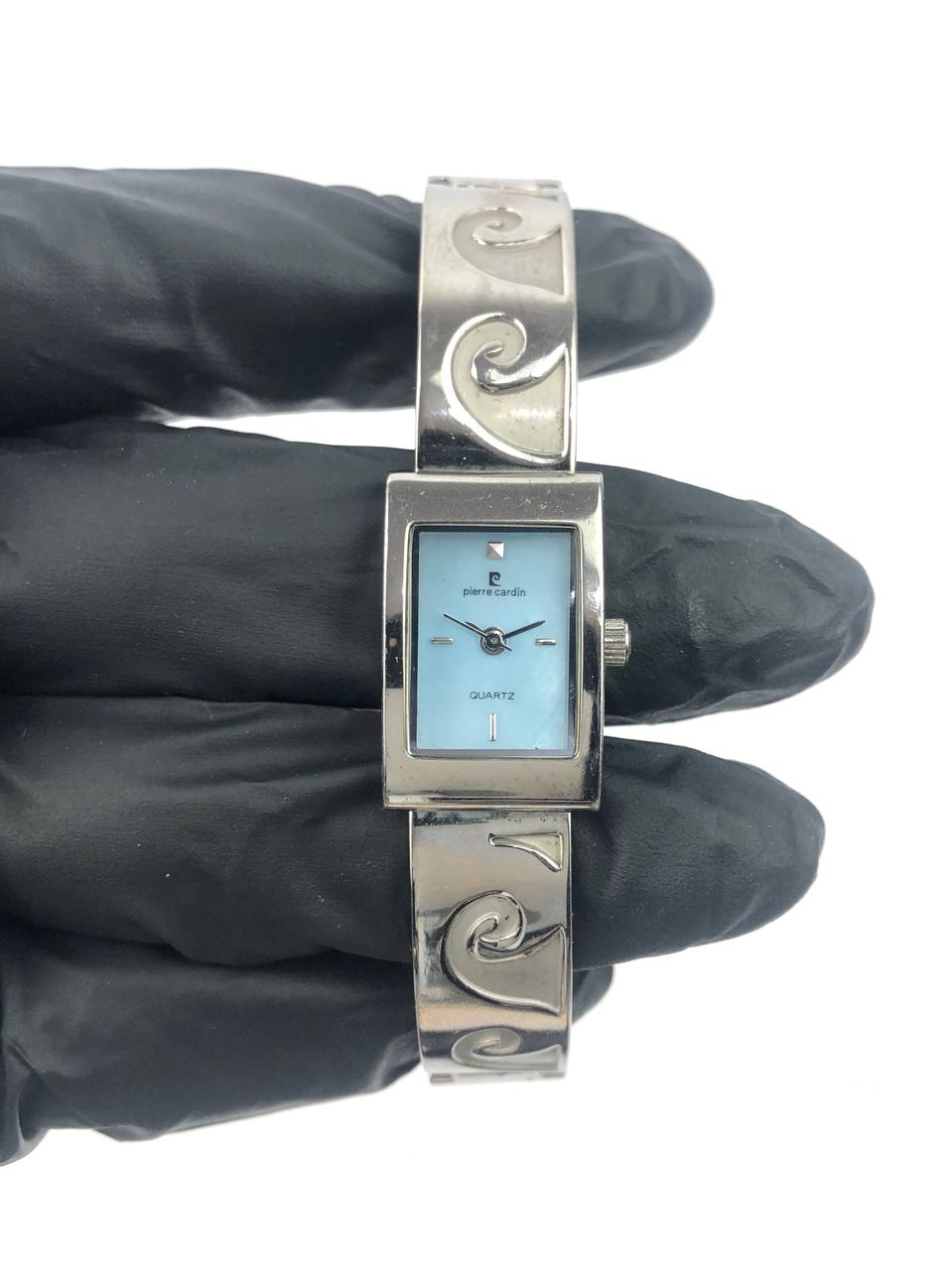 Pierre Cardin – Case Rectangular Silver, Dial Biru Muda, Strap Solid Wave-Link