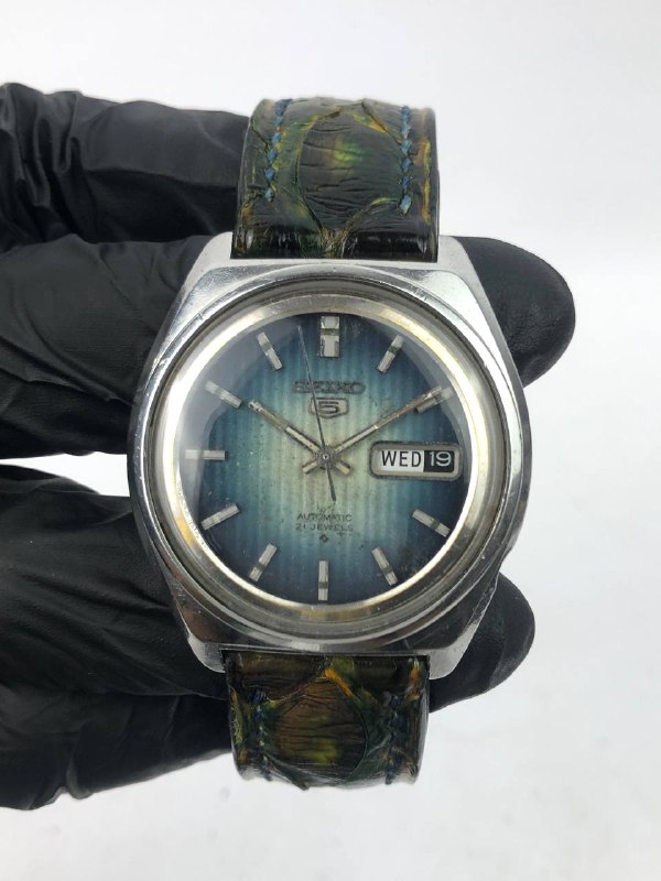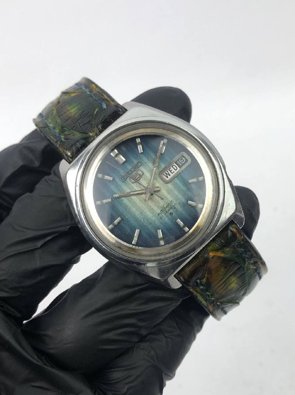 SEIKO 5 BLUE GRADIENT DIAL GREEN EMBOSSED LEATHER STRAP